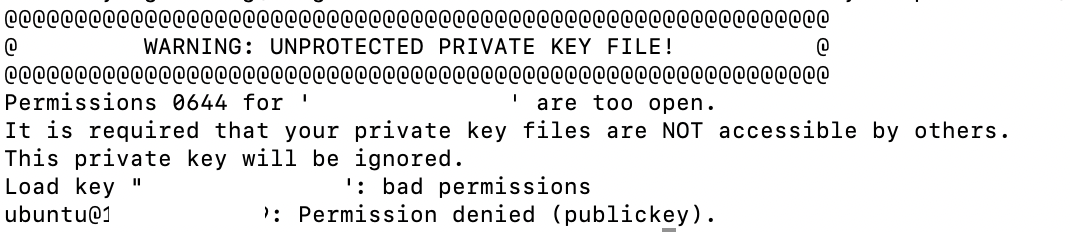If you cannot log in with the message “WARNING: UNPROTECTED PRIVATE KEY FILE!” as shown below, you need to change the permissions of the pem file.